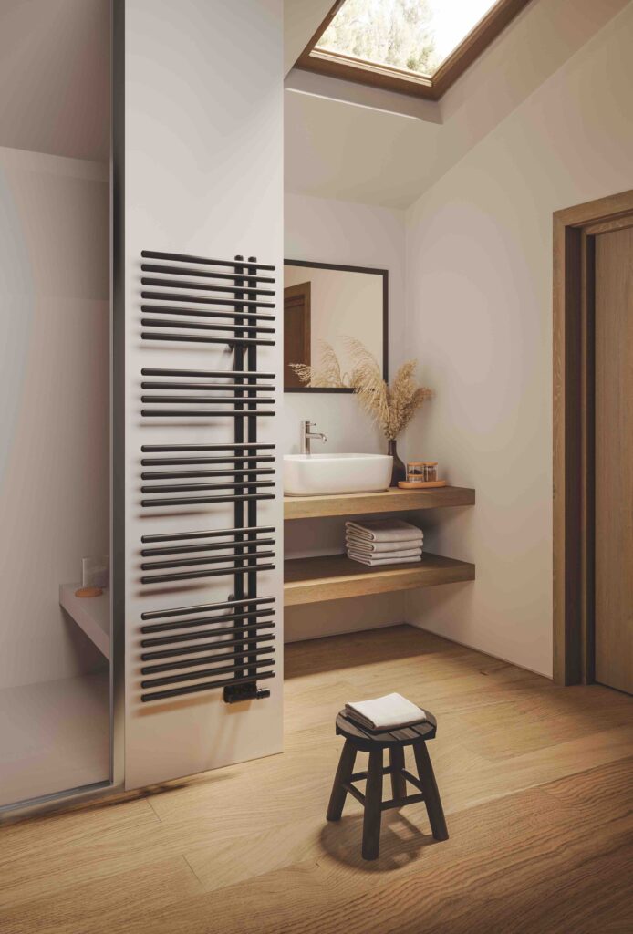 Con unas formas que marcan su carácter propio y reconocible, FUNKY_S se distingue por su estética depurada y expresiva. Su diseño, libre y contemporáneo, convierte al radiador toallero en una pieza con capacidad para estructurar el espacio. De este modo, aporta a la estancia cierto dinamismo y personalidad. Lejos de ser un simple elemento funcional, FUNKY_S actúa como un recurso de diseño que dialoga con la arquitectura y refuerza la identidad del conjunto.